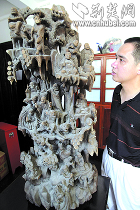 記者看到,這件樟木雕的十八羅漢高約1米,神態(tài)各異,栩栩如生。據(jù)介紹,羅漢是清代雕刻的,屬國(guó)家三級(jí)文物。