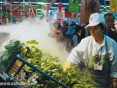 商業(yè)和物流的發(fā)展,讓購物環(huán)境變優(yōu)美了,品種更豐富了,市民可在明亮潔凈的超市中選購物品(下圖),甚至打個電話,點擊鼠標,足不出戶,需要的物品都能及時送到手中。武漢市正在發(fā)揮區(qū)位交通流通優(yōu)勢,成為萬商云集的“聚寶盆”。