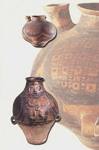 彩陶人像陶壺:水器(下,高34厘米)[相關(guān)鏈接]:20世紀(jì)中國百項考古大發(fā)現(xiàn)(1-20)21、大溪遺址(圖)22、城頭山遺址(圖)23、屈家?guī)X遺址(圖)24、崧澤遺址(圖)25、馬家窯遺址(圖)26、柳灣墓地(圖)27、牛河梁遺址(圖)28、城子崖遺址(圖)29、良渚文化遺址群(圖)30、石家河遺址群(圖)31、陶寺遺址(圖) 32、王城崗遺址(圖)33、齊家坪遺址(圖)34、卡若遺址(圖)35、石峽遺址(圖) 36、東灣仔北遺址(圖)37、圓山遺址(圖)38、二里頭遺址(圖)39、東下馮遺址(圖)40、夏家店遺址(圖)