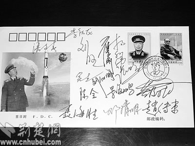 我國(guó)首批宇航員在傘訓(xùn)結(jié)束后留給傘訓(xùn)教官李振波的首日封,上面有楊利偉、聶海勝、費(fèi)俊龍、翟志剛、李慶龍、潘占春、劉旺、劉伯明、吳杰、張曉光、景海鵬、趙傳東、陳全、鄧清明14名宇航員的親筆簽名。湖北日?qǐng)?bào)記者徐和平特約記者趙啟洪攝