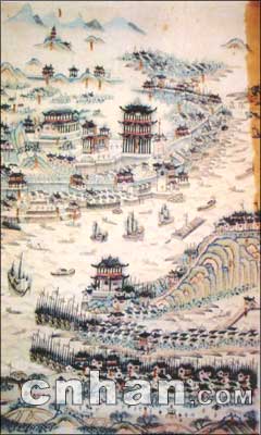 此圖藏于大連市圖書館,手繪彩圖。未標明作者姓名和成圖時間,圖中標注了武昌、漢口“龍王廟”等。筆者鑒定此圖為清代中期作品,根據(jù)是圖中有“龍王廟”,而龍王齋建于乾隆四年(1739年),故此圖當于1739年以后所繪。但圖中沒有出現(xiàn)漢口城堡,而漢口城堡建于1864年,同時圖中只繪有木帆船,而未出現(xiàn)現(xiàn)近代輪船。武漢江面出現(xiàn)航運和輪船是1862年以后?芍藞D當成于1862年前?纱篌w界定此圖繪于1739年至1862年之間。