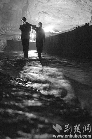 寂寞的蝙蝠第一次接待了人間來(lái)客,沉睡萬(wàn)年的巖溶洞穴第一次迎來(lái)了觀者。但黑暗陌生的世界還是讓堂堂男兒們感覺了一絲陰森恐怖。他們?cè)牣?dāng)?shù)匕傩諅髡f(shuō),洞里有巨蟒,所以至今沒人敢進(jìn)洞。“抓緊時(shí)間測(cè)量!”來(lái)不及恐懼,他們?yōu)樽约汗膭牛驗(yàn)檫@里隨時(shí)可能發(fā)生漲水、墜落等危險(xiǎn)。可惜,第一次經(jīng)驗(yàn)不足,手電筒的電池很快用完了,一行人只得互相攙扶著,摸索出溶洞!昂髞(lái),我們又進(jìn)去了7次,終于測(cè)出了暗河的具體位置和流向!狈轿奈湔f(shuō)。