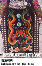 刺繡,是苗族婦女盛裝不可或缺的飾物,主要有領(lǐng)花、肩花、襟花、背塊花、袖口花、裙鑲花、帽頂花、帽頂花等品種。苗族刺繡,整體上多為幾何構(gòu)圖,古樸多姿。其圖案因繡片條、塊的不同,分為幾何二方連續(xù)式和四方連續(xù)式構(gòu)圖。其圖案取材于生活中常見的草木、鳥獸、蟲魚、器具等。圖案的整體布局一般以菱形為立體紋樣,常見的是大菱形中套小菱形,小菱形又分別由不同色彩的方、圓、三角點狀組成。條狀繡片,多用點、線或線面組合,一整二剖構(gòu)圖。繡片是按布的經(jīng)緯戳針,故曲線多折角。大塊繡片,如背塊花等,多用菱形四方連續(xù)構(gòu)圖,并在其中布以對稱的變形幾何點及其他折線。所有繡片,粗看五彩斑斕,細(xì)觀則不同色線組圖分明,交錯重疊,既復(fù)雜多變又結(jié)構(gòu)嚴(yán)謹(jǐn)、條理清晰。繡法很多,有平繡、凸繡、辮繡、堆花、縐繡、纏繡、挑繡、抽花等。平繡是最曾遍的繡法。這種繡法是重于圖案布局的美觀勻稱,色調(diào)鮮明,有明顯的物象感。凸繡流行于凱里、臺江部分地區(qū),它是在底布上多鋪幾層紙花,使所繡圖案凸出,有立體感。辮繡只在雷公山巴拉河一帶流行,其方法是將若干根色線編成辮子,按設(shè)計圖案平鋪于底布上,用絲線釘牢即成。圖案色調(diào)大致是青年女子鮮艷,中年以上婦女稍渾暗。如凱里、黃平、施秉等地,姑娘及較年輕婦女的盛裝刺繡以青布作底,繡大紅,間有少量白黃綠之色,亮麗醒目;中年以上婦女盛裝刺繡,亦以青布作底,以紫藍(lán)為基調(diào),間以少許桔紅、綠、白等色,顯得深沉穩(wěn)重。