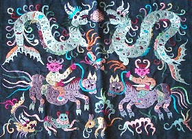 從春秋中期到戰(zhàn)國時,楚國的刺繡品已遠(yuǎn)銷到西伯利亞地區(qū),可見其刺繡業(yè)之發(fā)達(dá)。南方的楚國絲織業(yè)足以代表當(dāng)時我國絲織品工藝技術(shù)的最高水平。屈原的《楚辭·招魂》為我們描繪了一幅楚宮絲織品圖畫,“翡翠珠被,爛齊光些。蒻阿拂壁,羅帳張些;纂組綺縞,結(jié)琦璜些!鋷鋷,飾高堂些”,“被文服纖,麗而不奇些。”這種需求對刺繡品的生產(chǎn)、發(fā)展的刺激是不難想見的。同時,楚文化氛圍下民間戲曲的發(fā)達(dá)、巫風(fēng)巫月術(shù)的盛行又為刺繡走向民間提供了生長的沃土。