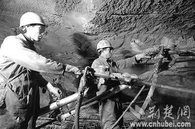 穿著雨衣的工人們手持風(fēng)槍?zhuān)谀_手架上下打爆破眼,山體里的水嘩啦啦直往下噴,然后順著挖好的水槽排向洞外,最多時(shí)一天要排3000立方米!斑@水算小的!”也許是察覺(jué)出我們眼神里的擔(dān)心,包秀峰輕松笑笑,仿佛一切都在他們掌控中。他甚至調(diào)侃說(shuō),“瞧,我們都穿皮鞋上班,施工環(huán)境沒(méi)你們想象中那么艱難!