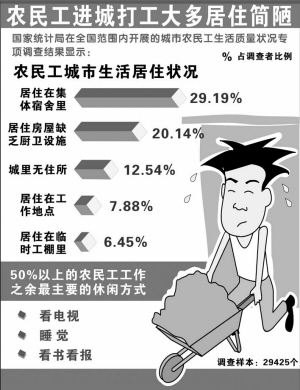 此外,農(nóng)民工生活質(zhì)量普遍不高。首先是農(nóng)民工生活、衛(wèi)生條件差。受工資水平低限制,大部分農(nóng)民工的月消費幾乎全部用于住宿和食品消費,而在生病時,只有少數(shù)人會選擇去正規(guī)醫(yī)院,其他人大都選擇自己買藥治療或去個體診所。其次是居住環(huán)境質(zhì)量差。近40%的農(nóng)民工居住在工棚或集體宿舍里,地方狹窄擁擠,室內(nèi)骯臟零亂,除了被褥衣物,幾無他物。