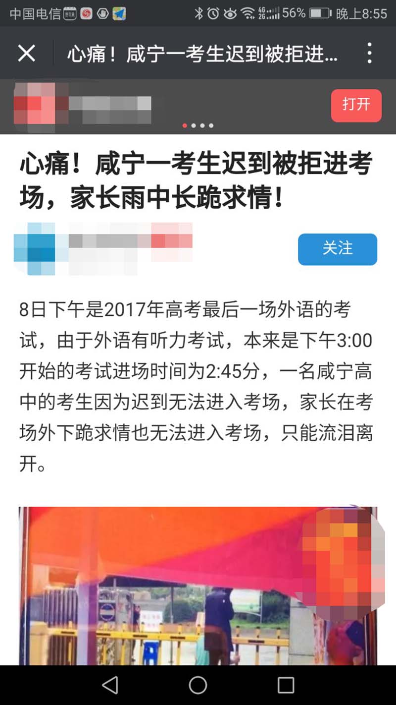 這則消息的內容是:今天下午是2017年高考最后一場外語的考試。一名咸寧高中的考生因遲到8分鐘,無法進入鄂南高中考場。家長在考場大門外下跪求情也無法進入考場,只能流淚離開。