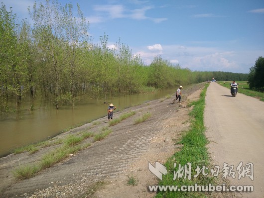 在接興村附近堤段,48歲的村民駱傳見正在為自家的責任堤段除草。他介紹,按照防汛要求,必須將雜草清理干凈,方便巡查。說話間,他接到電話通知,明天參加巡堤值守。