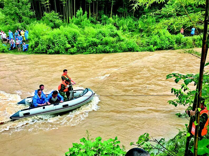 圖為昨日清晨崇陽40人送葬隊伍突遇山洪被困,消防官兵拋繩擺渡安全轉移。
