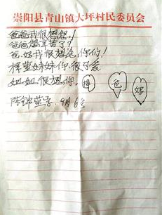在箱底,童鵬飛發(fā)現(xiàn)了一封信,字不多也不算工整,但明顯可以看出寫得很認(rèn)真。信紙上畫了三顆心,里面分別寫著“梓”“爸”“媽”字樣,落款為“陳錦瑩字,9月6號”。“這應(yīng)該是叫陳錦瑩的小朋友寫給爸爸媽媽的信,信不見了的話,孩子應(yīng)該會很傷心的?!笨吹叫偶埵恰扒嗌芥?zhèn)大坪村村委會”的,童鵬飛立即聯(lián)系了青山派出所,請求協(xié)助尋找陳錦瑩小朋友。遺憾的是,查無此人。