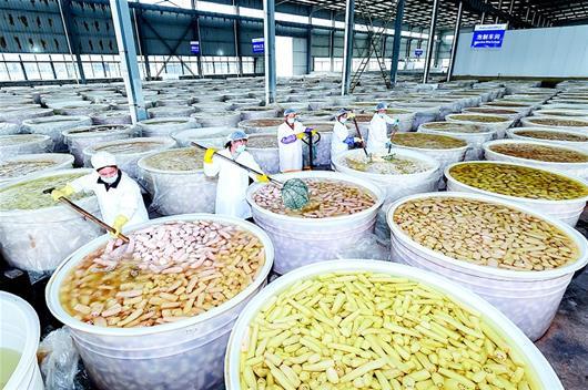 湖北日報(bào)訊 眼下,正值蓮藕收獲季節(jié)。位于嘉魚縣陸溪鎮(zhèn)的嘉珍生態(tài)農(nóng)業(yè)發(fā)展有限公司車間內(nèi),工人們正在開封、準(zhǔn)備啟運(yùn)泡制的蓮藕產(chǎn)品。2012年嘉魚珍湖蓮藕登上《舌尖上的中國》后名聲大噪,國家質(zhì)檢總局近日正式批準(zhǔn)“嘉魚蓮藕”為國家地理標(biāo)志保護(hù)產(chǎn)品。目前,嘉魚縣每年生產(chǎn)蓮藕、蓮子和藕帶6萬多噸,產(chǎn)品銷往全國各地,并出口到歐美和東南亞等地區(qū)。(記者 陳勇 視界網(wǎng) 龍鈺 攝)