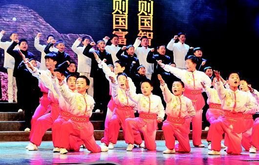 “野無遺賢,萬邦咸寧;首出庶物,萬國咸寧……”12月19日,由省委宣傳部、省教育廳、省廣播電視臺聯(lián)合主辦的“同聲誦經(jīng)典——2017湖北省‘起點閱讀·朝讀經(jīng)典’校園巡回展演活動”走進(jìn)咸寧。當(dāng)天下午,在咸寧市會議中心,稚嫩的童聲、整齊的朗誦,配舞臺水墨畫的背景,讓在場的近千名中小學(xué)生如入詩畫之境?!斑筮髲?fù)唧唧,木蘭當(dāng)戶織。不聞機(jī)杼聲,唯聞女嘆息……”一首《木蘭詩》讓觀眾們猶如置身于北朝的烽煙中,青年花木蘭敢于擔(dān)當(dāng)?shù)木褡屓司磁澹档卯?dāng)代青少年學(xué)習(xí)借鑒。