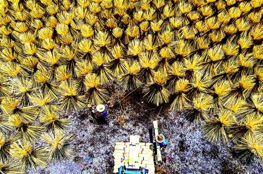 6月25日,咸寧市咸安區(qū)汀泗橋鎮(zhèn)赤崗村鑫源竹加工廠,工人們正在翻曬一捆捆長長的竹筷子,宛如一朵朵花開在曬場上。咸安區(qū)竹資源豐富,當(dāng)?shù)亟ǔ煽稍偕闹裱h(huán)產(chǎn)業(yè),有上下游竹加工廠20多個,滿山翠竹成為當(dāng)?shù)剞r(nóng)民的“致富竹”。