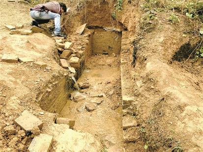 昨日上午,楚天都市報記者驅(qū)車來到該村,被盜的古墓離孫師傅家約有1公里路程,他帶著記者翻山來到現(xiàn)場。記者現(xiàn)場看到,該墓在一條公路邊上,墓穴已被挖開,長約3米,寬約70厘米,墓室由青磚砌成。青磚比普通磚要薄,有的青磚上還有花紋。
