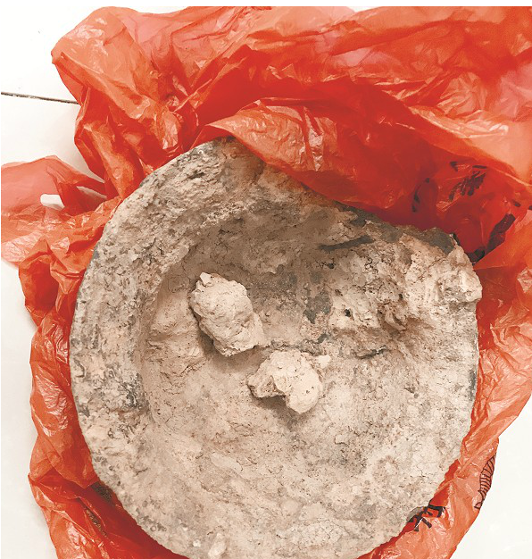 孫師傅說,當(dāng)村民趕過去的時候,墓穴已被挖開,不少周邊村民都前來圍觀,有人還在墓穴周圍找到了一些銅錢。他們當(dāng)即報警,當(dāng)日下午,崇陽縣博物館館長匡文、金塘派出所刑偵人員趕到現(xiàn)場進(jìn)行了勘查。據(jù)目擊村民介紹,盜挖古墓的是該村的宋某和退休人員盧某,共挖出了6件文物。當(dāng)天,在警方調(diào)查時,宋某交出了一個破罐、一個鐵器等物件。