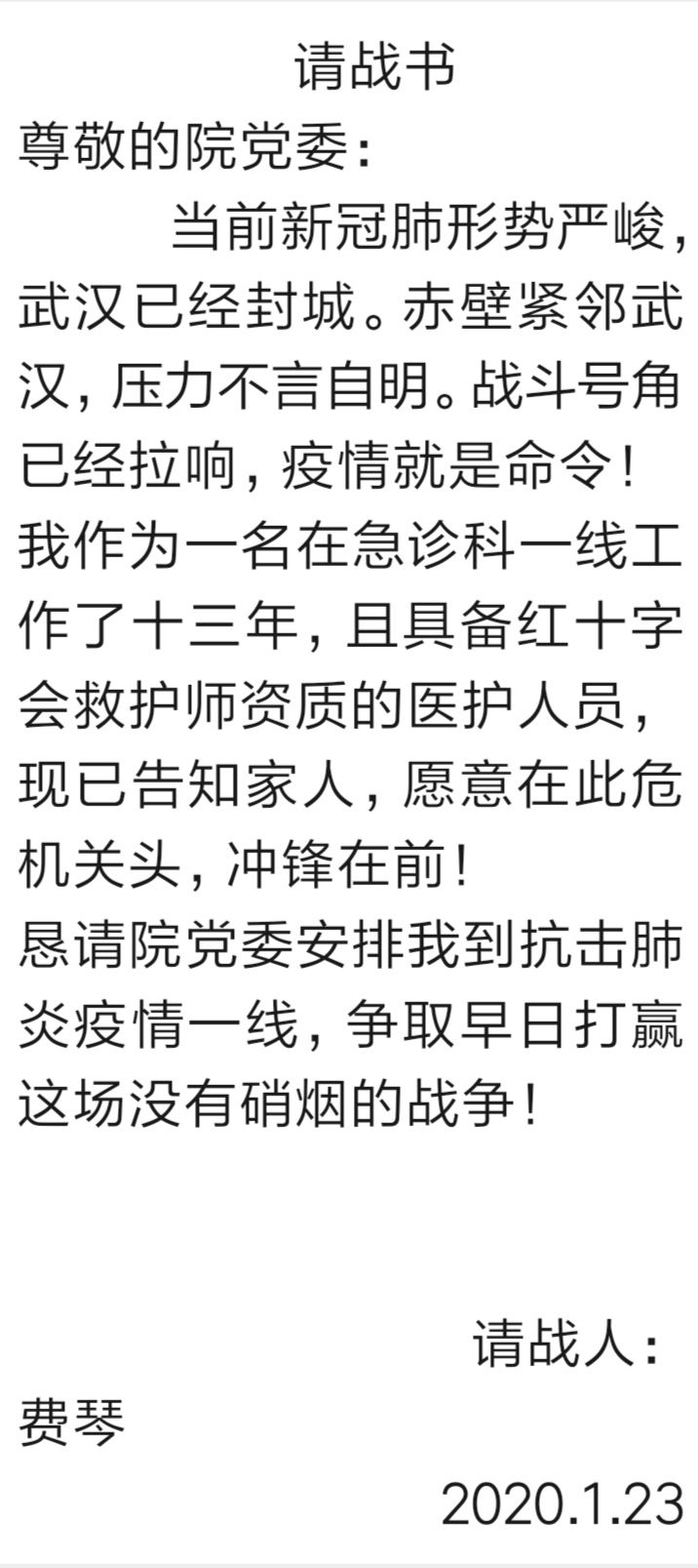 “我作為一名在急診科一線工作了十三年,且具備紅十字會救護師資質(zhì)的醫(yī)護人員,現(xiàn)已告知家人,愿意在此危機關(guān)頭,沖鋒在前。”這是來自市人民醫(yī)院急診科醫(yī)護人員費琴的請戰(zhàn)書內(nèi)容,讓人淚目。