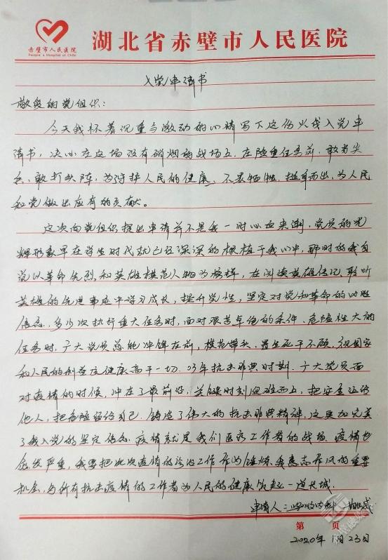 “今天我懷著無比激動的心情寫下這份入黨申請書,決心在這場沒有硝煙的戰(zhàn)場上,不畏犧牲,挺身而出?!边@是來自市人民醫(yī)院90后呼吸內(nèi)科住院醫(yī)師姚威的入黨申請書。