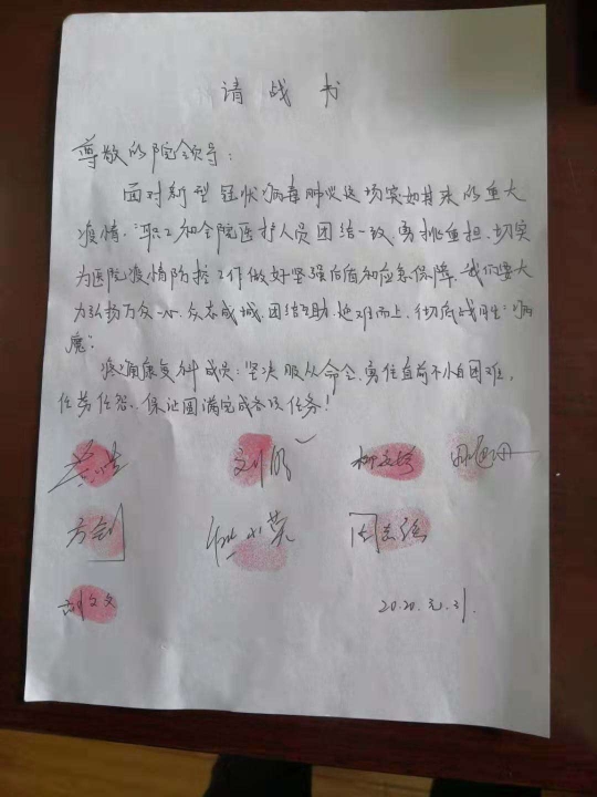 “葉書記,我們志愿加入抗擊新型冠狀病毒感染的肺炎防控工作中!”“葉書記,請讓我們上!”當接到市防控指揮部命令,需要醫(yī)護人員增援,第二人民醫(yī)院院黨總支書記葉躍平同志在醫(yī)院微信群里發(fā)出了動員令,隨后,一封封蓋滿手印的請戰(zhàn)書遞到了他的桌上。