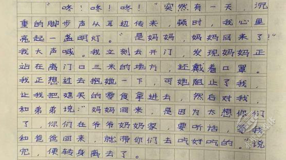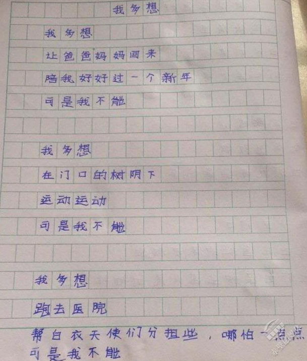 夫妻倆的大寶二寶,被托付給爺爺奶奶照料。多日不見父母,他偷偷寫下一首詩(shī)《我多想》:“我多想,讓爸爸媽媽回來(lái),陪我好好過(guò)一個(gè)新年,可是我不能……我多想,跑去醫(yī)院,幫白衣天使分擔(dān)一些,哪怕一點(diǎn)點(diǎn),可是我不能……”字里行間,流溢出滿滿的思念。