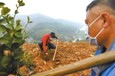 塘湖鎮(zhèn)閣壁村鳳形山上,在新開墾的油茶基地里,幾十位工人戴著口罩正忙著打窩、放苗、培土。