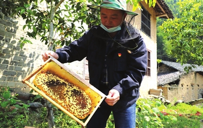 二組王必珍,今年70歲,是建檔立卡貧困戶。1990年右手截肢,靠養(yǎng)幾箱蜜蜂度生,并不斷投資蜂業(yè)。他介紹,養(yǎng)蜂是個好產(chǎn)業(yè),他雖然手不方便,但活兒不累。他與記者算起賬。他說,一個蜂箱有5個框,一個框搖糖1到1.5斤。一個箱一年搖糖3到4次,每斤糖按50元計算,20個箱就是2萬多元。深山無污染,一年四季有蜜源,九月黃、牛藤、勾藤、芙蓉花等,就是冬天,也有柃木開花。