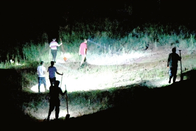 22:43分。在長江赤壁干堤11號哨所責(zé)任堤段,七束燈光在護(hù)堤林中閃耀。