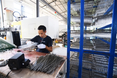 14日,通山縣經(jīng)濟(jì)開(kāi)發(fā)區(qū)低碳產(chǎn)業(yè)園創(chuàng)盛光學(xué)有限公司,工人在眼鏡鏡片生產(chǎn)線上作業(yè)。