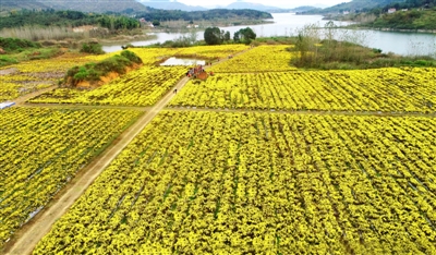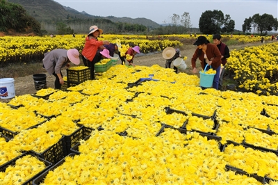 11月4日,通山縣燕廈鄉(xiāng)湖畔村皇菊種植基地,金絲皇菊怒放,猶如一張金色地毯舒展在田野上,村民穿梭在花叢中采收菊花。燕廈鄉(xiāng)湖畔村是典型的庫區(qū)貧困村,近年來,市公共檢驗檢測中心駐村工作隊和燕廈鄉(xiāng)黨委政府結(jié)合湖畔村地理環(huán)境,成立村集體合作社,打造60畝金絲皇菊種植基地,延伸菊花深加工產(chǎn)業(yè)鏈,通過與貧困戶采取“勞務(wù)聯(lián)結(jié)機制”簽署合同協(xié)議,讓村民實現(xiàn)家門口就業(yè)。