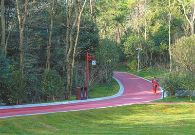 新鋪的草坪如巨大的綠毯,與蜿蜒的紅色健身步道相映成趣。不少市民帶著孩子在草坪上曬太陽(yáng)、嬉戲,還有三三兩兩散步、登山的人。路旁一株紅梅初綻,引得路人拍照留影。
