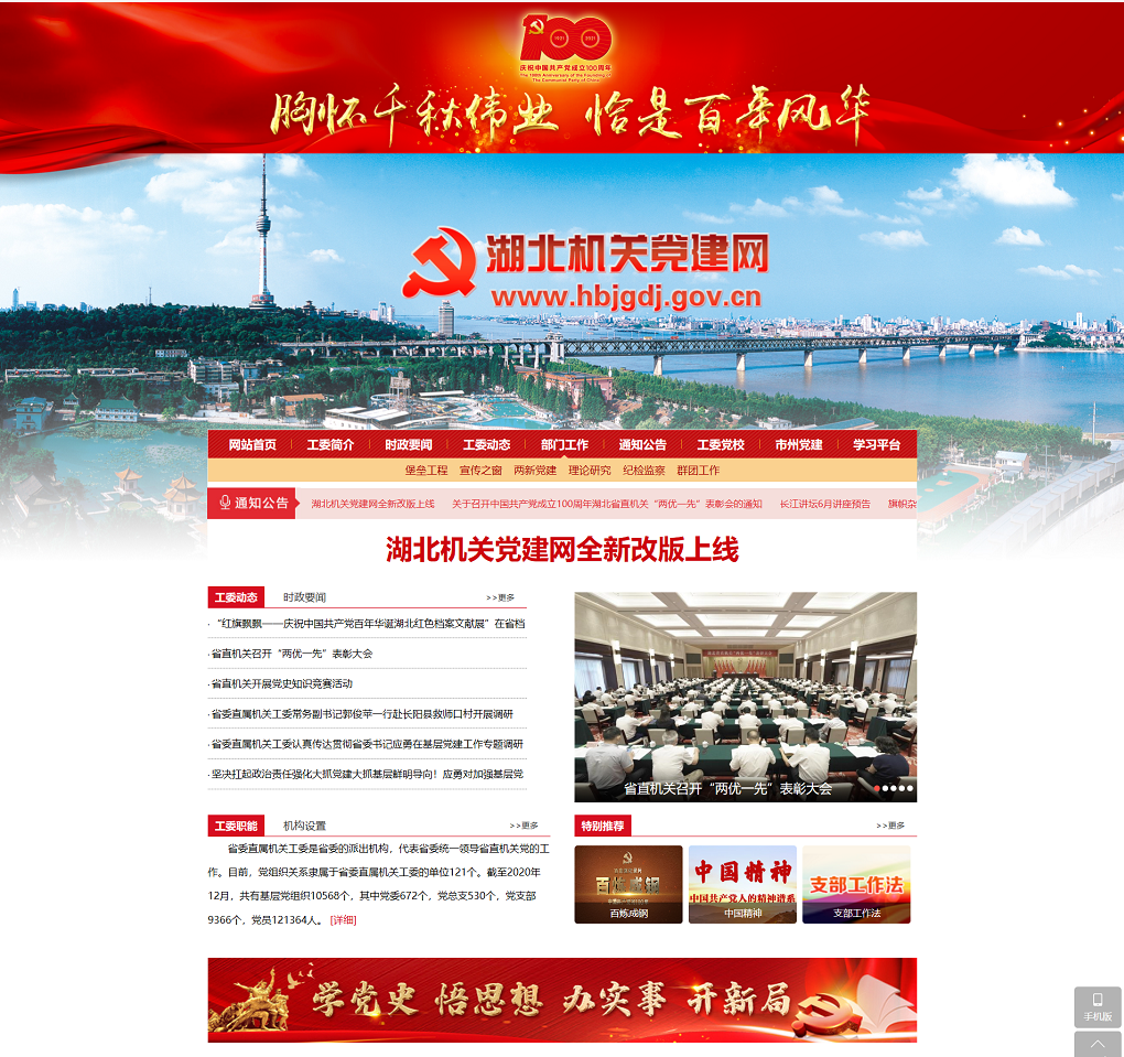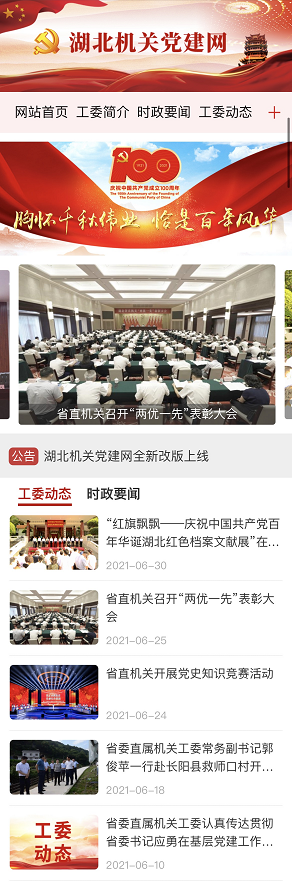 荊楚網(wǎng)(湖北日報(bào)網(wǎng))訊(記者謝頤 通訊員鄭羽嬋)在中國共產(chǎn)黨成立100周年之際,湖北機(jī)關(guān)黨建門戶網(wǎng)站湖北機(jī)關(guān)黨建網(wǎng)(http://www.hbjgdj.gov.cn/)電腦端、移動(dòng)端全新改版上線。這是省委直屬機(jī)關(guān)工委積極探索智慧黨建的有效途徑,是加強(qiáng)省直機(jī)關(guān)黨建宣傳工作的重要舉措,是為黨慶生、為黨祝福獻(xiàn)上的特殊禮物。