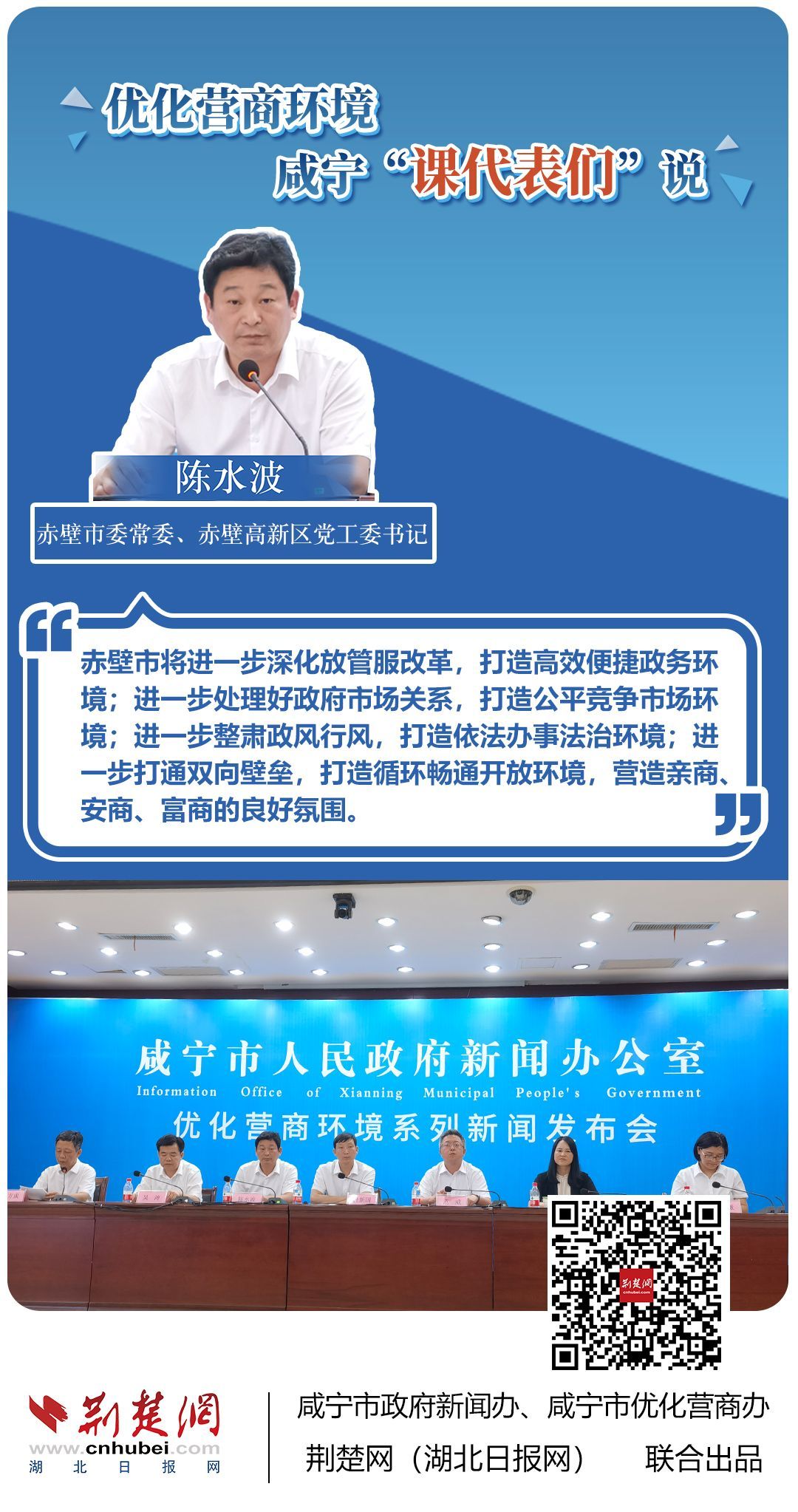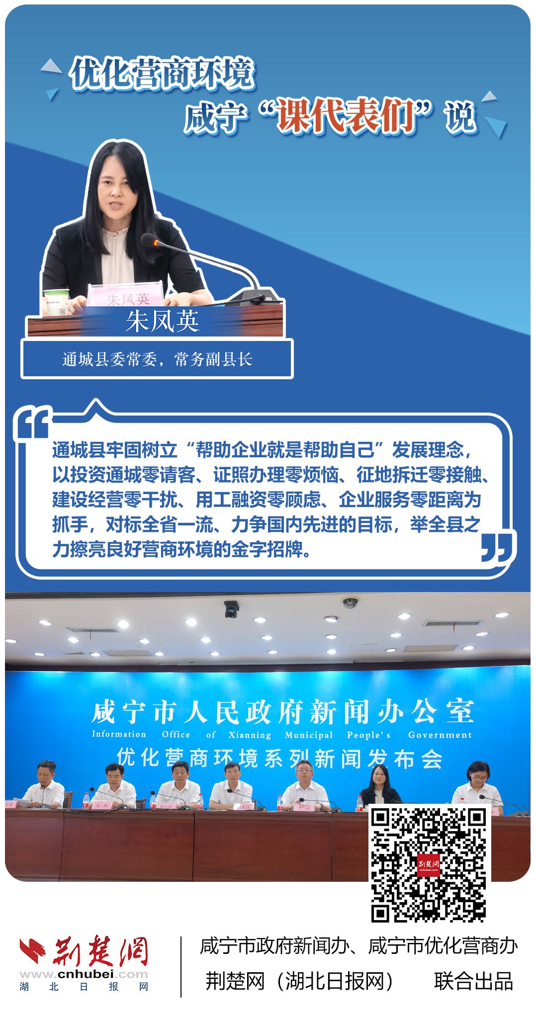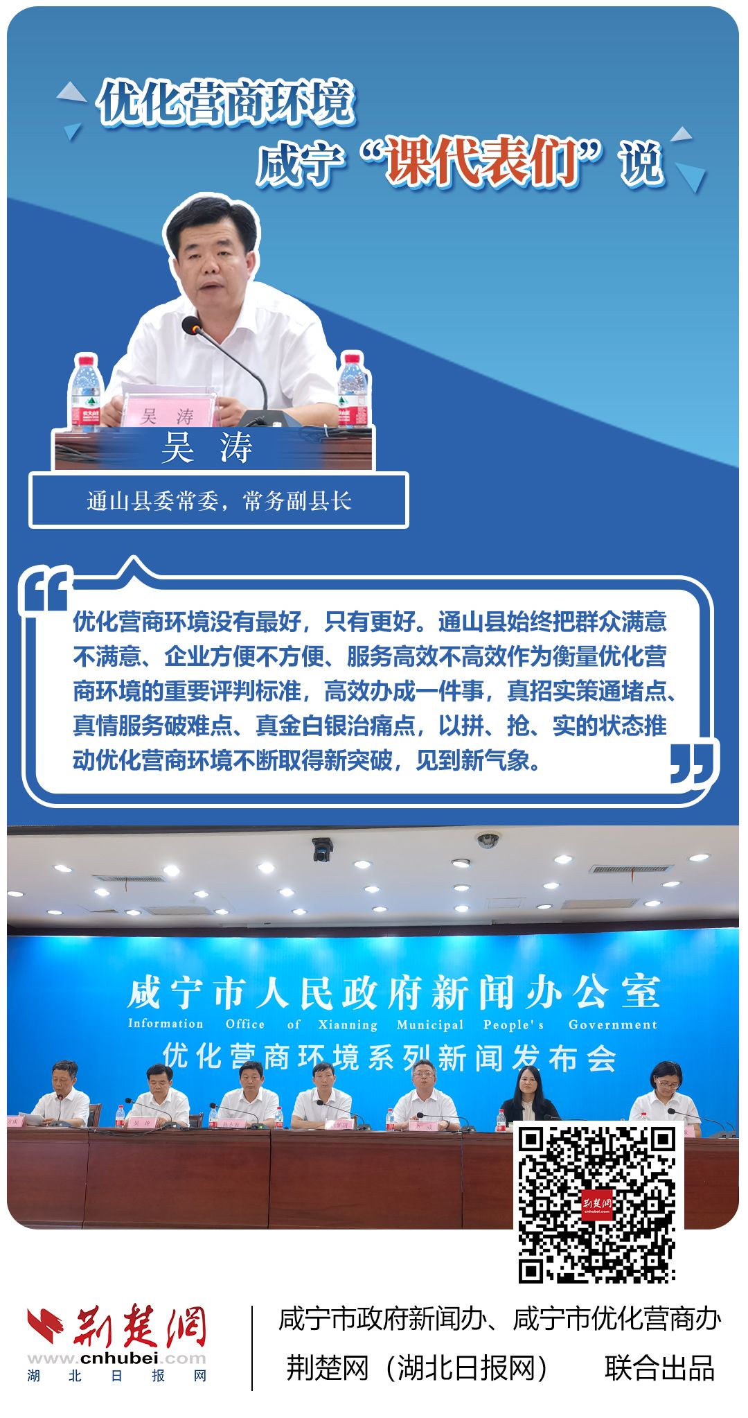 荊楚網(wǎng)(湖北日報網(wǎng))訊(記者 田城 通訊員 孫方成 張永紅)跨省通辦、“零干擾環(huán)境”、最簡流程優(yōu)服務、深化“放管服”改革、整肅行風政風……7月20日下午,咸寧市召開優(yōu)化營商環(huán)境新聞發(fā)布會。會上,咸安區(qū)、嘉魚縣、赤壁市、通城縣、崇陽縣、通山縣6個縣市區(qū)優(yōu)化營商環(huán)境發(fā)言人亮相,全面介紹當?shù)貎?yōu)化營商環(huán)境有關(guān)情況,持續(xù)推進咸寧市營商環(huán)境朝著更優(yōu)、更好方向前進。