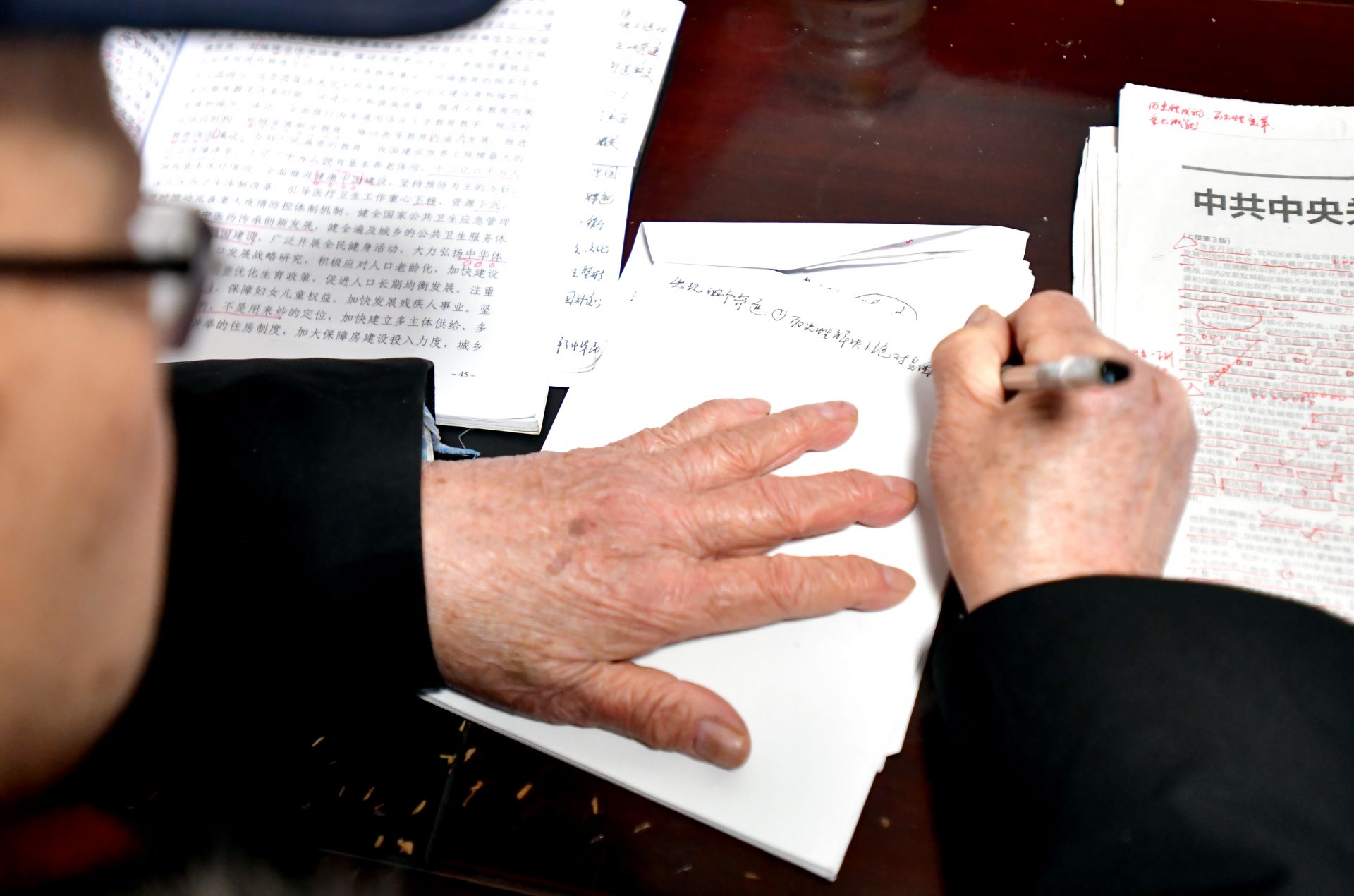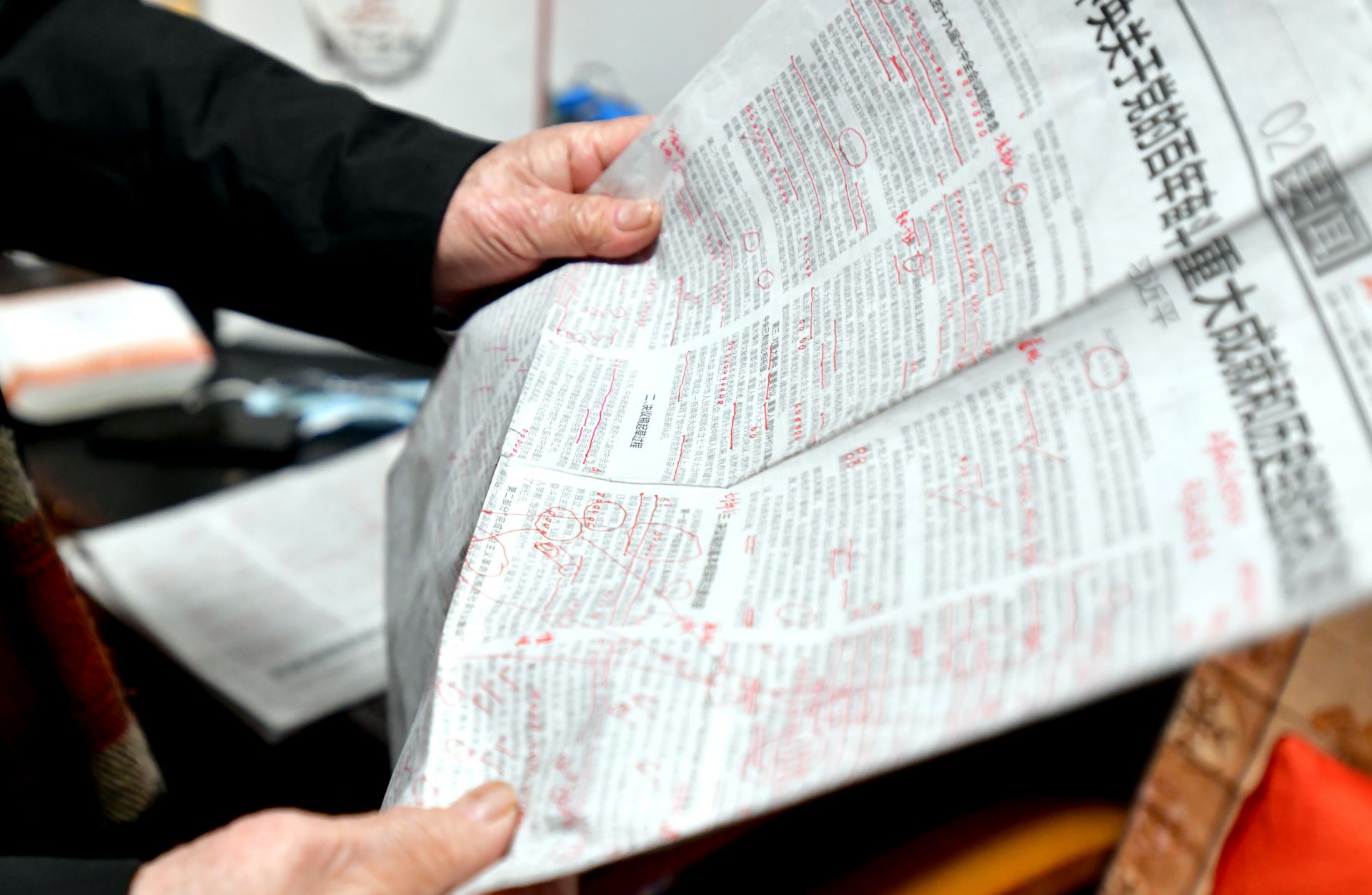 他的書桌上堆滿了厚厚的書籍,筆筒插著一面小國旗,面前攤開的報紙上,紅色的標(biāo)注分外醒目。老人正一筆一劃、不疾不徐地做著筆記。