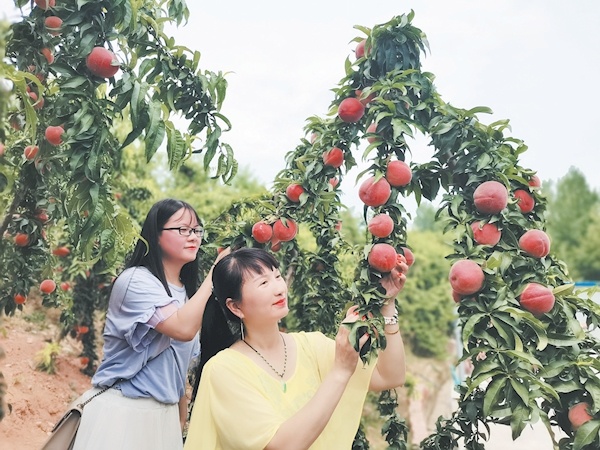 6月8日,游客在丹江口市均縣鎮(zhèn)均州蜜桃采摘園采摘蜜桃。眼下,正值蜜桃成熟期,該園吸引了不少游客前來采摘。據(jù)了解,2019年4月,原鄉(xiāng)人張慶華投資400多萬元成立丹江口市億園果樹種植專業(yè)合作社,在當(dāng)?shù)亓鬓D(zhuǎn)200余畝荒地種植蜜桃,今年可采摘蜜桃25萬公斤,收入200余萬元,帶動(dòng)70余名農(nóng)戶平均增收6000元。記者李平攝