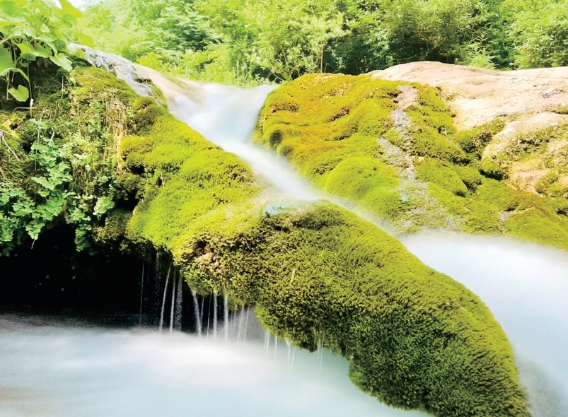 瀑布流經(jīng)之處,表面結(jié)滿翠綠色、黃綠色、鵝黃色的苔蘚,色彩美麗。