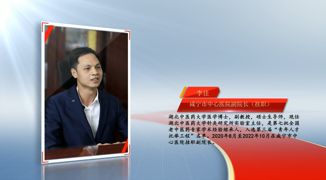 【人物名片】李佳, 湖北中醫(yī)藥大學(xué)醫(yī)學(xué)博士,副教授,碩士生導(dǎo)師,現(xiàn)任湖北中醫(yī)藥大學(xué)針灸研究所實(shí)驗(yàn)室主任,是第七批全國老中醫(yī)藥專家學(xué)術(shù)經(jīng)驗(yàn)繼承人,入選第三屆“青年人才托舉工程”名單。2020年8月至2022年10月在咸寧市中心醫(yī)院掛職副院長。