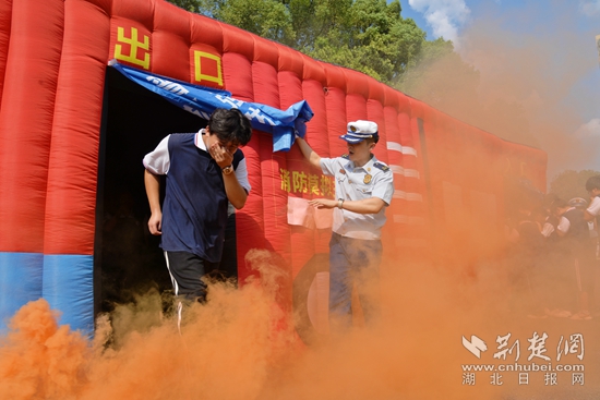 伴隨著陣陣緊促的警笛聲在校園響起,一教室內(nèi)“電線短路”,引燃桌面書籍,頓時(shí)濃煙滾滾?!罢?qǐng)各位同學(xué)不要驚慌,捂住口鼻、低頭彎腰、貼墻往樓下有效進(jìn)行疏散......”廣播中傳來疏散指令,消防員指導(dǎo)全體師生從“安全出口”有序迅速撤離,通過體驗(yàn)“生命通道”,使師生掌握火場(chǎng)疏散逃生技能。