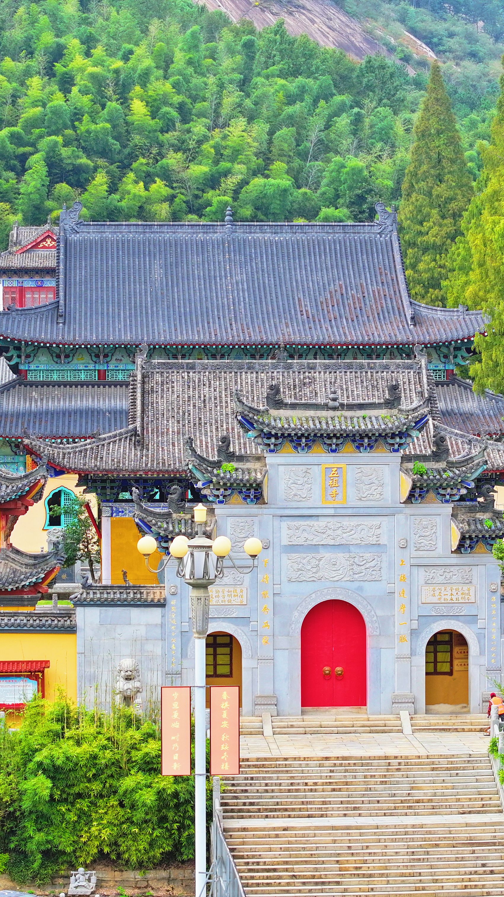 終點(diǎn)處山門,是古代通往五祖寺的必經(jīng)之路。古山門始建于唐大中年間,迄今1100年歷史。山門用青麻石柳筑而成,為城樓式,古樸典雅,莊重大方。