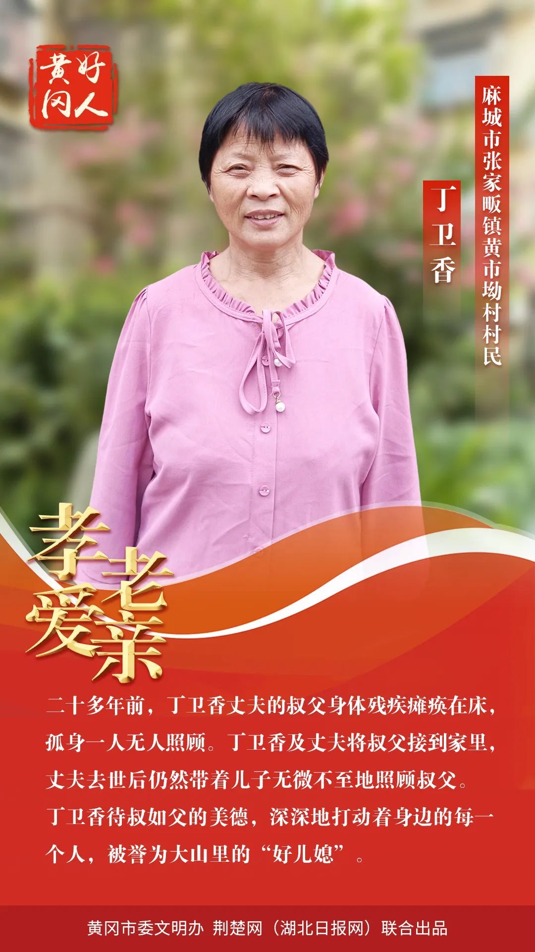 本期“黃岡好人”共有5組好人入選。他們中,有“見義勇為,勇救落水者”的秦遵照;有“扎根基層七十余載老醫(yī)”的張自強(qiáng);有“孝老愛親,待叔如父,被譽(yù)為大山里‘好兒媳’”的丁衛(wèi)香;有“助人為樂,從事志愿服務(wù)30余年的”的汪天明;有“助人為樂,創(chuàng)建了‘向陽花’留守兒童之家品牌”的張靜。