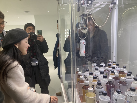 采風(fēng)團一行走進元氣森林咸寧工廠,通過沉浸式觀光通道,一行人零距離感受生產(chǎn)過程,只見飲料生產(chǎn)線正高速運轉(zhuǎn),一瓶瓶飲料飛速被裝進箱子里,統(tǒng)一打包進入倉庫。
