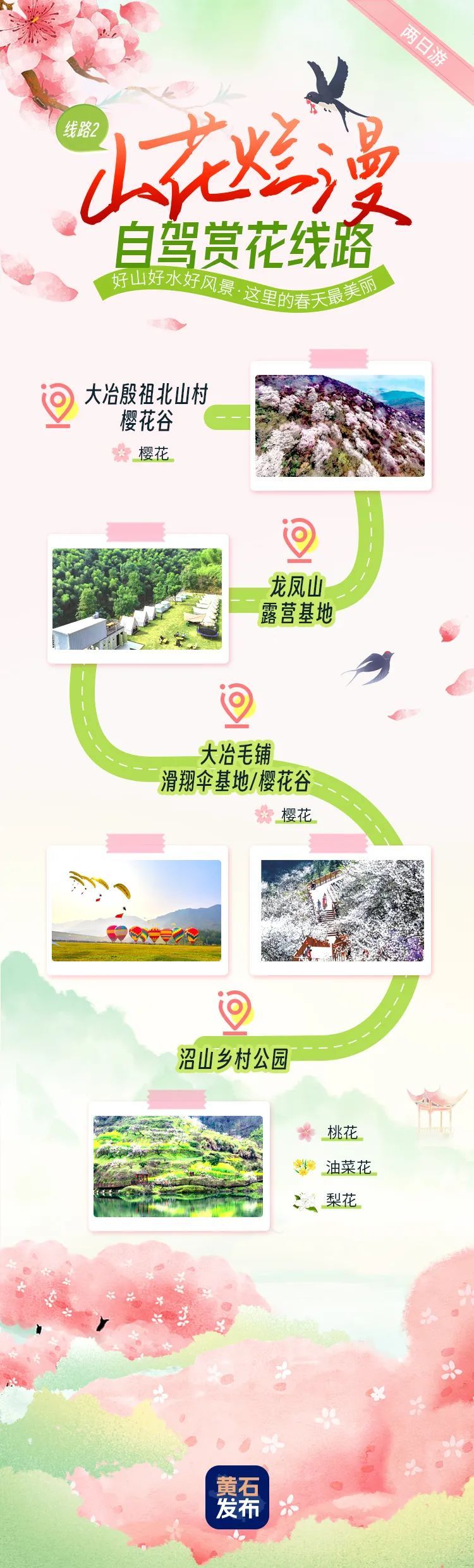 大冶殷祖北山村櫻花谷-龍鳳山露營(yíng)基地-大冶毛鋪滑翔傘基地/櫻花谷-沼山鄉(xiāng)村公園。