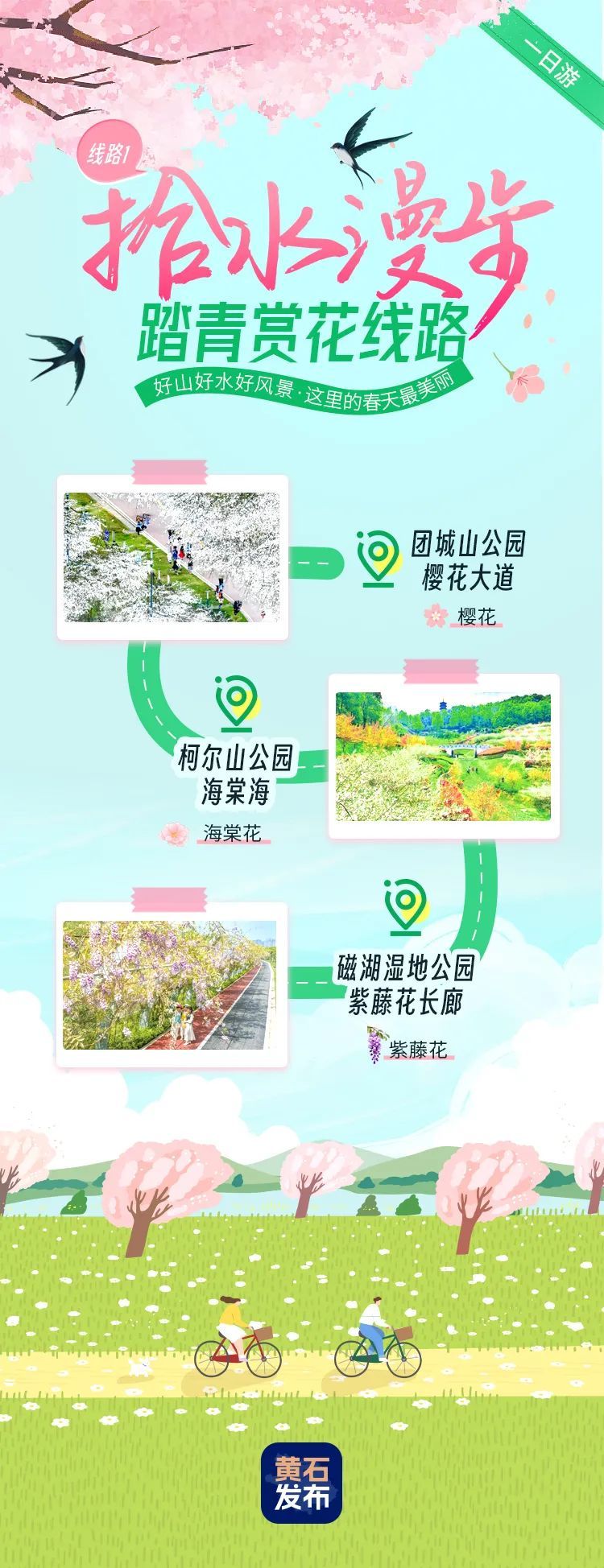 團(tuán)城山公園櫻花大道-柯爾山公園海棠海-磁湖濕地公園紫藤花長(zhǎng)廊