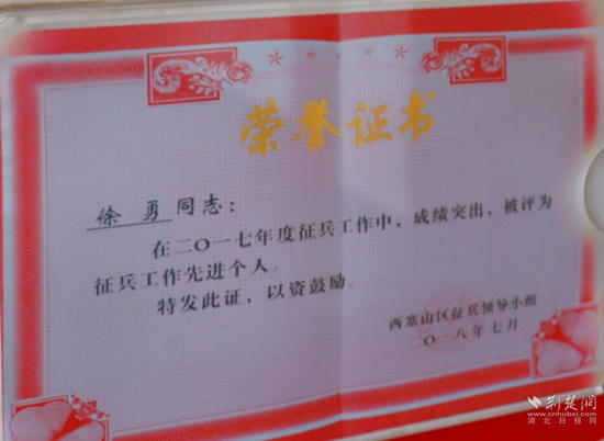 1994年12月10日一早,徐勇穿著嶄新的軍裝,背著背包在家等候。上午9時(shí)許,源建里社區(qū)居民委員會一行人敲鑼打鼓地來到徐勇家里,將一朵鮮艷的大紅花戴在徐勇胸前,一路將徐勇送到石灰窯區(qū)(現(xiàn)西塞山區(qū))政府。