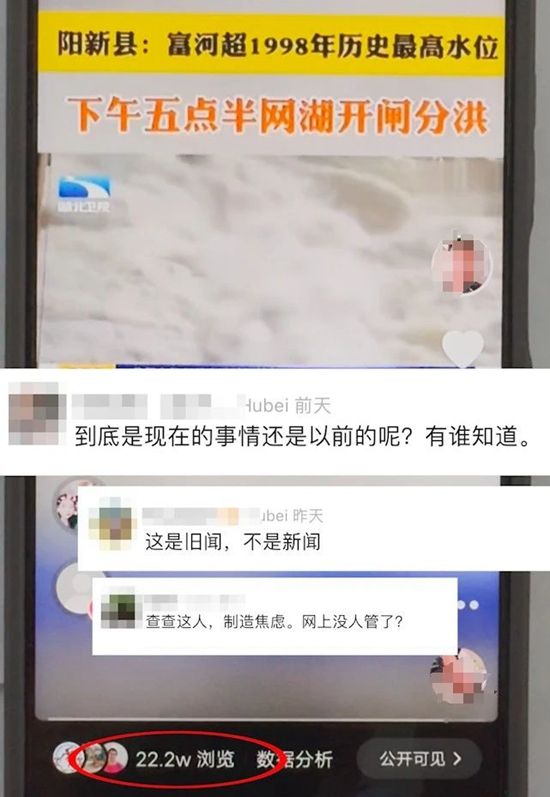 該視頻一經(jīng)發(fā)布,立即引起了廣大網(wǎng)民的關(guān)注和擔(dān)憂,誤導(dǎo)網(wǎng)民認為發(fā)生了洪災(zāi)險情。相關(guān)視頻發(fā)布后瀏覽量達22.2萬人次,在一定程度上引發(fā)了公眾恐慌。