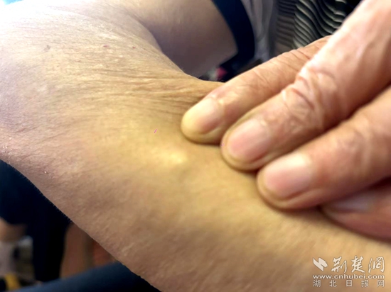 彈片已經(jīng)完全融入老人的手臂上。呂鑒蕾 攝