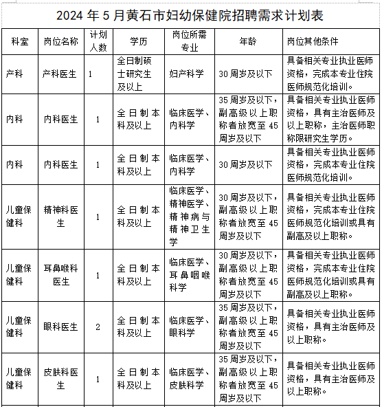 荊楚網(wǎng)(湖北日報網(wǎng))訊(記者 謝龍飛)近日,黃石市婦幼保健院發(fā)布2024年5月招聘聘用制工作人員公告,將招聘18名聘用制工作人員,涵蓋產科醫(yī)生、內科醫(yī)生、精神科醫(yī)生、兒科醫(yī)生等,具體崗位詳見下表。
