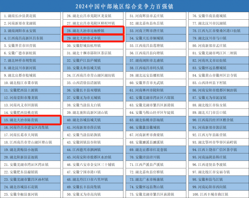 荊楚網(wǎng)(湖北日?qǐng)?bào)網(wǎng))訊(記者左乙辰 通訊員 陳向東 羅蒙 范國(guó)安)近日,2024年鄉(xiāng)鎮(zhèn)高質(zhì)量發(fā)展交流會(huì)在湖南長(zhǎng)沙召開,會(huì)上揭曉了2024年中國(guó)中部地區(qū)綜合競(jìng)爭(zhēng)力百?gòu)?qiáng)鎮(zhèn)名單,大冶市陳貴鎮(zhèn)、還地橋鎮(zhèn)、靈鄉(xiāng)鎮(zhèn)上榜,分列第15、28、29位。