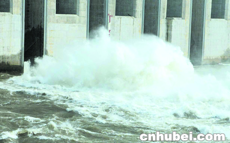 昨日,三峽大壩上游水位已達89.36米,下游水位66.42米。晚6時,大壩泄洪閘旁,波濤洶涌;而大壩上游,水波不興,江水如鏡。 楚天都市報記者陳建剛楊峰洲攝
