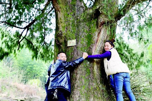 越往山里走,森林越茂密,古樹也越來多。在該村三組的一座老宅后,記者看到一片古樹群。最先映入眼簾的是一棵國家一級柏樹,上面布滿黑褐色紋理,樹干得幾人合圍。不遠(yuǎn)處,還有國家二級杉榔、二級柏樹等,整個山坡,就被大大小小幾十棵大樹遮蔽,其中被掛牌保護(hù)的就有8棵?!拔覀兇逵?1個自然村灣,每個灣子都有這樣的原始老林,而且很多都已被掛牌保護(hù),這是村里最大的財富?!贝逯淌烂髡f。他還給記者講了個故事,有一年,一家知名公司的人看上這里的樹,他們愿意出價三萬元,買走其中一棵,但村民們毫不心動,當(dāng)場就給拒絕了!