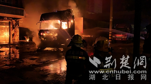 圖為消防指戰(zhàn)員撲滅貨車火災(zāi)現(xiàn)場?!⌒椭螖z