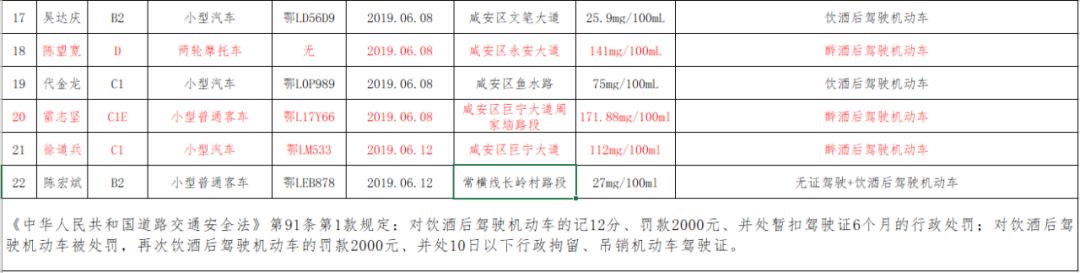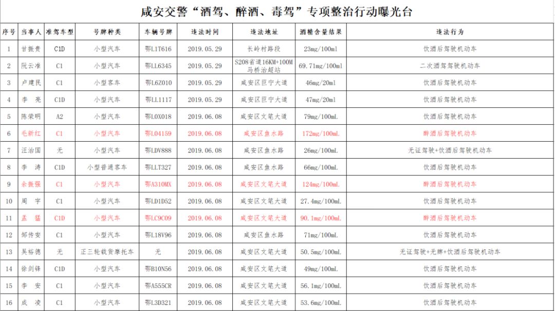 咸安公安分局交警大隊(duì)對(duì)酒駕醉駕持續(xù)保持高壓嚴(yán)管“零容忍”態(tài)勢(shì),同時(shí)對(duì)近半個(gè)月(5月29日——6月13日)以來的酒駕醉駕駕駛?cè)诉M(jìn)行實(shí)名曝光。